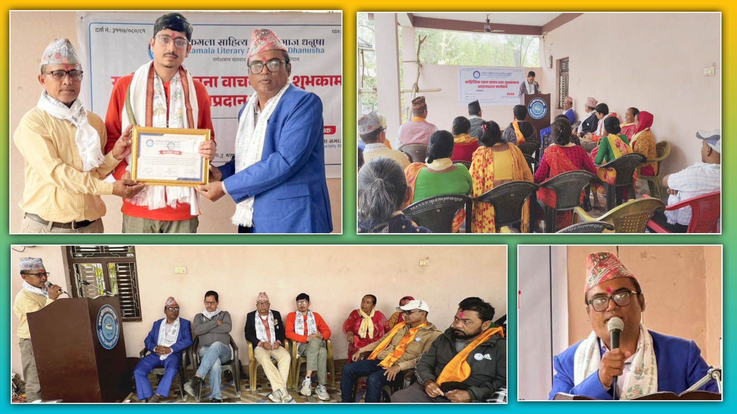 उक्त अवसरमा अतिथिहरूलाई खादा र सम्मानपत्र प्रदान गर्दै कमला साहित्य कला समाजका ब्याच वितरण गरियो ।