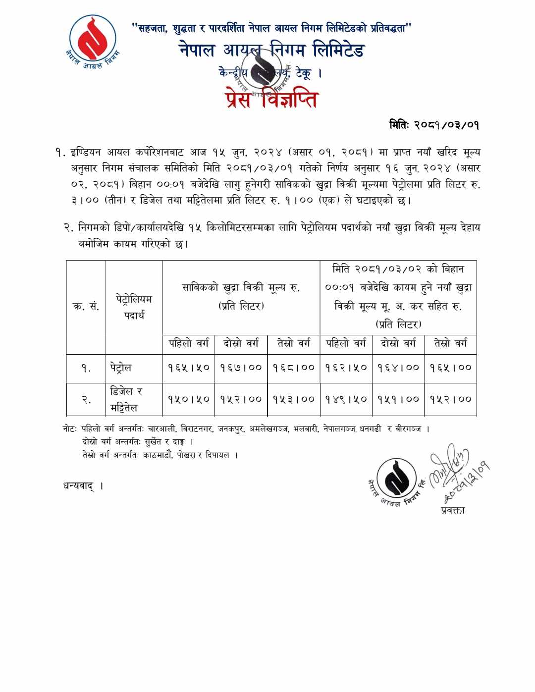 इन्डियन आयल कर्पोरेसनबाट जुन १५ अर्थात असार १५ गते प्राप्त नयाँ खरिद मूल्यअनुसार निगमको सञ्चालक समितिको बैठकले असार २ गते बिहान १ बजेदेखि लागू हुनेगरी मूल्य घटाएको आयल निगमले जनाएको छ ।