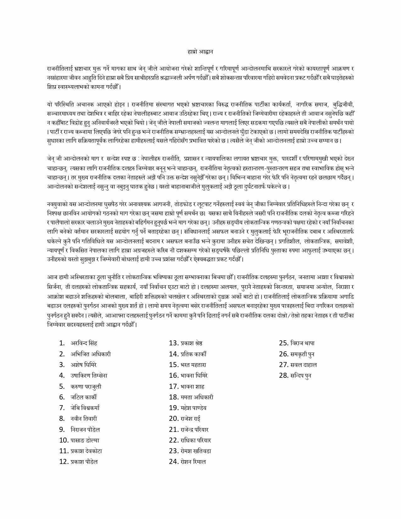 विज्ञप्तिमा भनिएको छ, “लामो समयदेखि नेतृत्वमा बसेर राजनीतिलाई असफल बनाइरहेका मुख्य पात्रहरूलाई बिदा नगरिकन दलहरूको पुनर्गठन सम्भव छैन। त्यसैले, आफ्ना-आफ्ना दलहरूलाई पुनर्गठन गर्ने कार्यमा ढिलाइ नगर्न सबै दलका दोस्रो र तेस्रो तहका नेताहरू तथा जिम्मेवार सदस्यहरूलाई हामी आह्वान गर्दछौँ।”